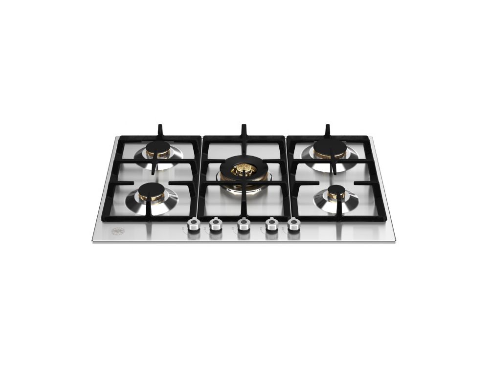 Газовая варочная панель Bertazzoni серии Professional шириной 75 см выполнена из нержавеющей стали. Благодаря пяти латунным конфоркам и эргономичным металлическим рукояткам управления, приготовление пищи становится простым, универсальным и предсказуемым. Конфорка wok с двойным рядом пламени мощностью 4кВт, расположенная в центре панели, добавляет новые возможности приготовления блюд. Чугунная решетка прочная и безопасная.