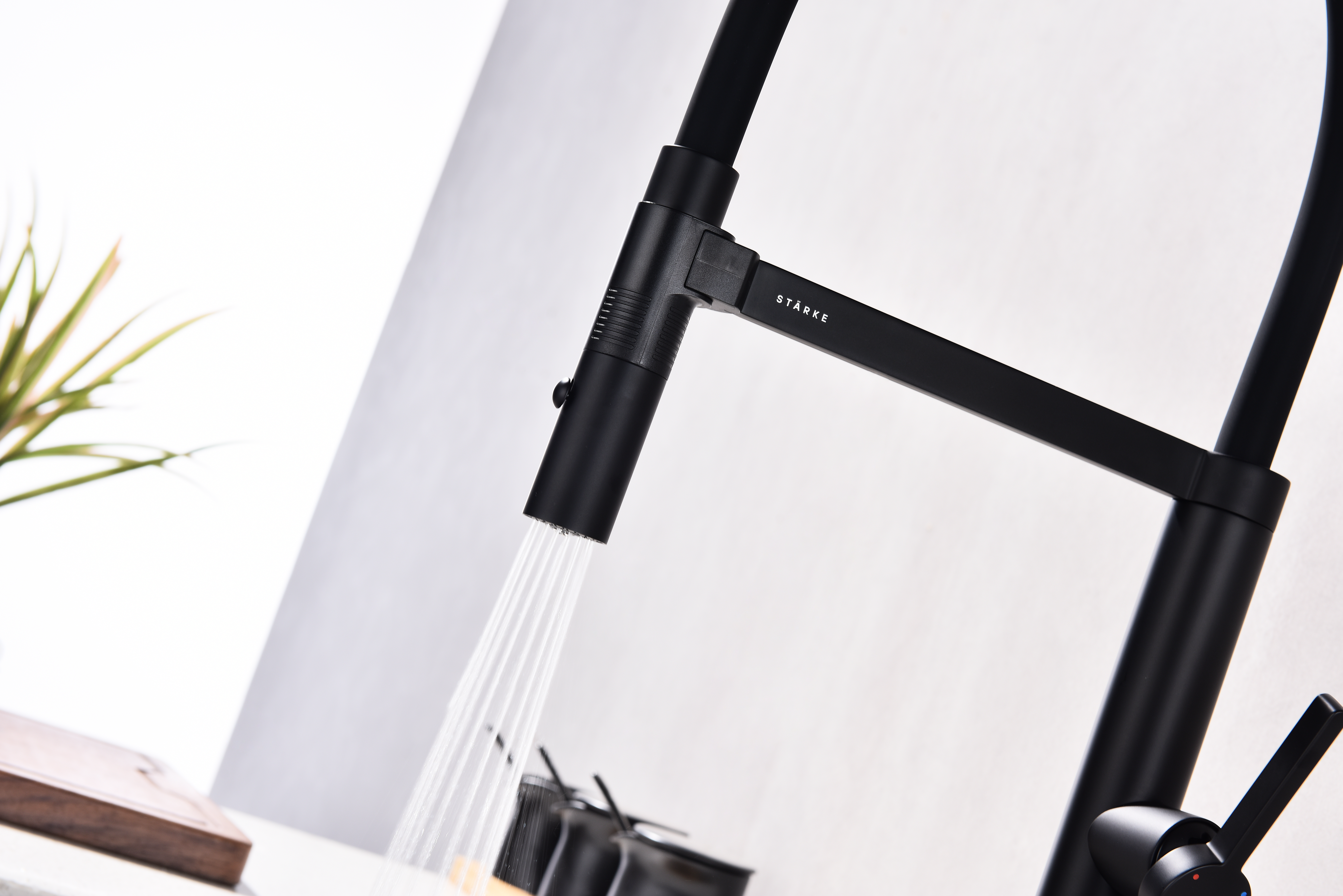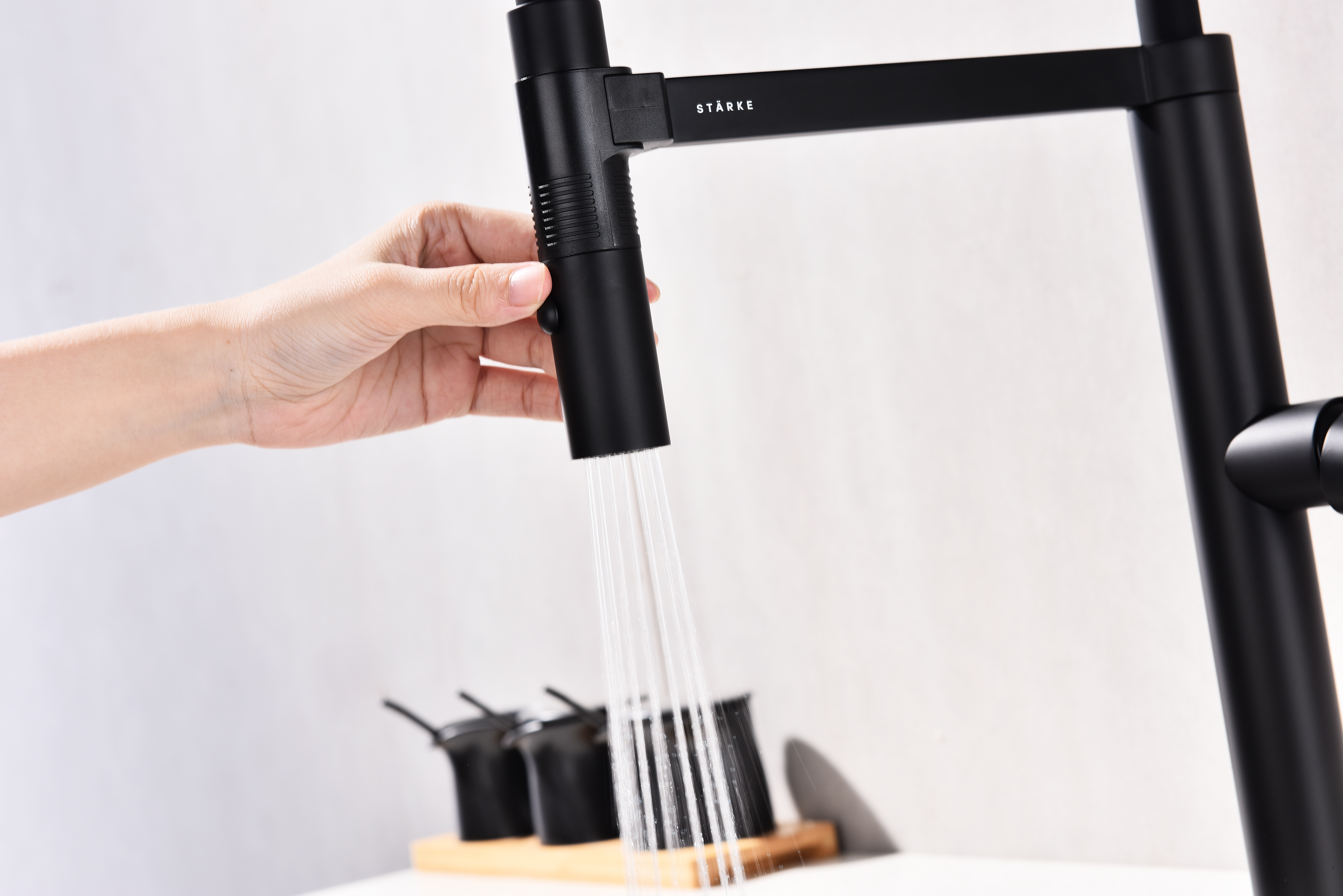 Излив смесителя выполнен из высокопрочного силикона. Конструкцией предусмотрен магнитный механизм фиксации излива.
